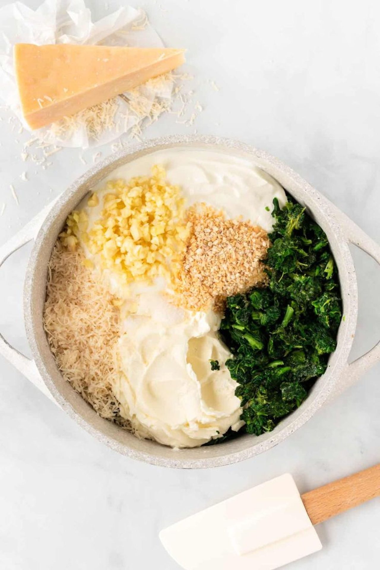 Gently fold in the spinach and shredded mozzarella cheese, ensuring everything is evenly incorporated.